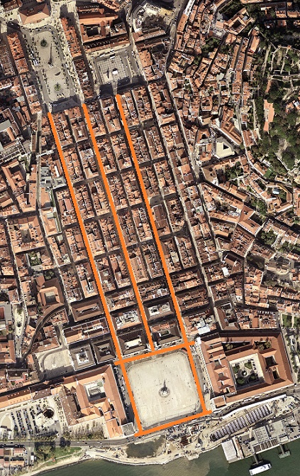 É visível, nesta planta da Lisboa pombalina - o plano dos engenheiros Eugénio dos Santos e Carlos Mardel - o traçado geométrico das ruas: paralelas e perpendiculares.